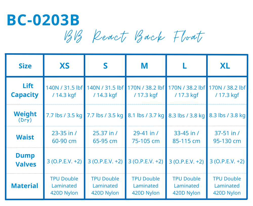 The TUSA BB REACT BACK FLOAT has a new release tank buckle and bladder shape as part of a revolutionized harness system. The new system holds weight closer to the body to improve comfort and stability, eliminating tank roll.