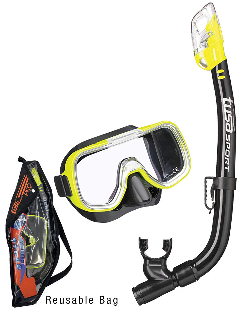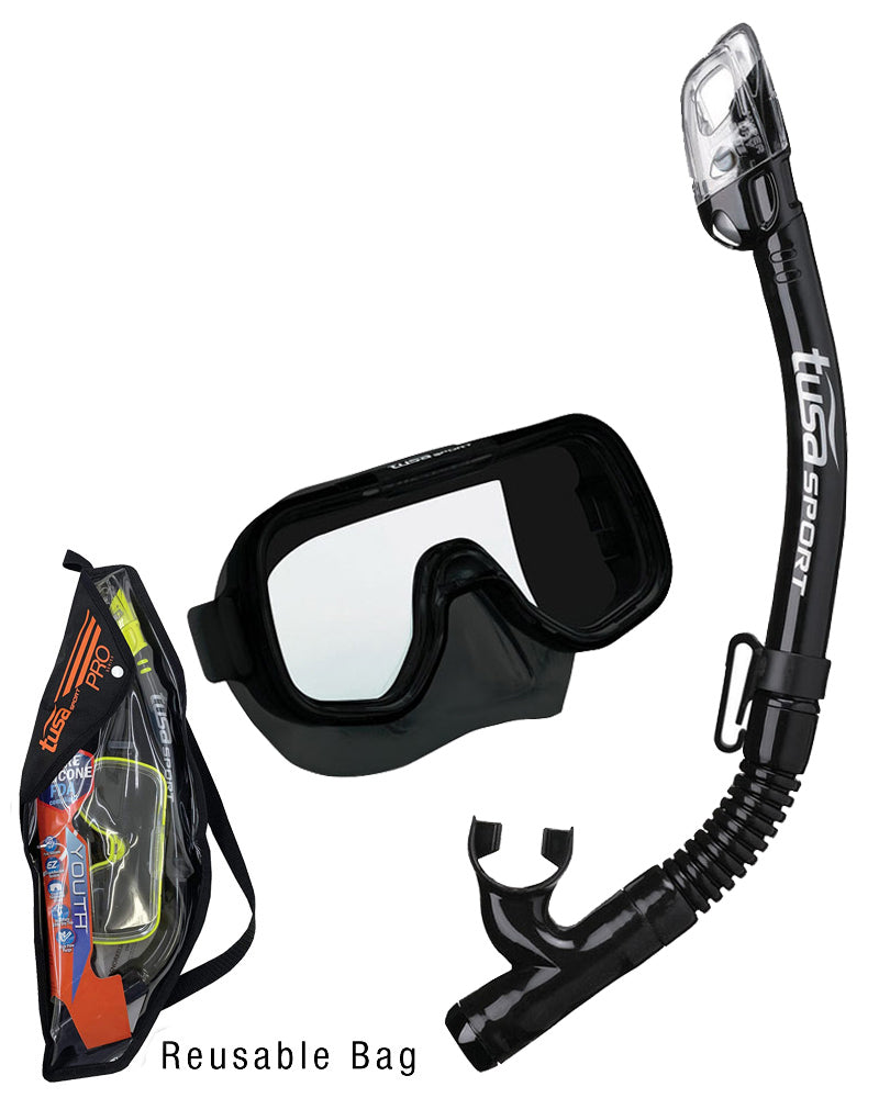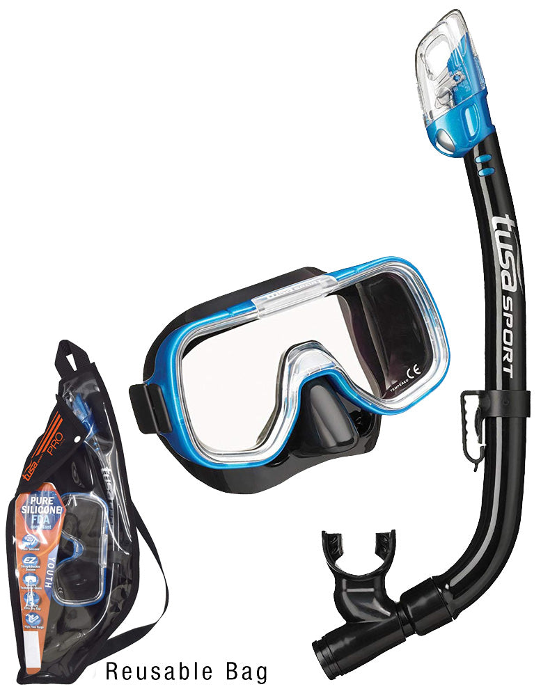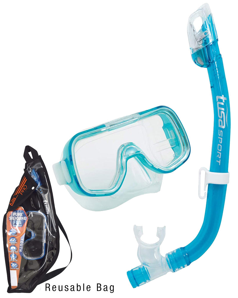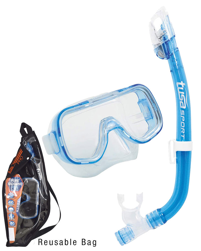 The TUSA SPORT UC2022 MINI KLEIO YOUTH COMBO includes a low volume 1-window mask with enhanced vision, EZ adjust buckle technology, ClearVu tempered glass lens and pure silicone skirt and strap